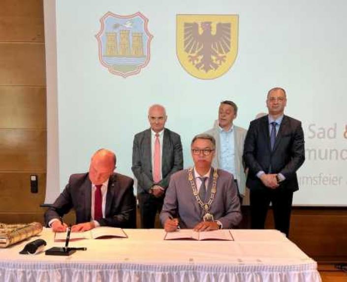 - Данашњим потписивањем Свечаног акта, обележавајући jубилеј од 40 година успостављања сарадње између Дортмунда и Новог Сада, ми учвршћујемо наше већ успостављене односе и настављамо да у доброј вери радимо на неговању истих. У претходне четири деценије показали смо да Повеља о братимљењу није само протоколарни гест, већ да сведочи о искреном пријатељству на којем су грађени бројни програми и пројекти, посебно у областима спорта и културе. Досадашња сарадња између Новог Сада и Дортмунда је била плодоносна, очекујем да у будућности буде још интензивнија и да наше братство и пријатељство буде добар пример и другим градовима – истакао је Милан Ђурић.